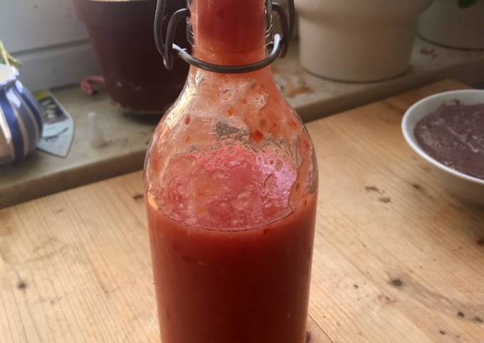 - Tomaten entstiehlen und grob hacken, Zwiebel schälen und grob schneiden, Chili kleinschneiden - ich habe auch etwa die Hälfte der Kerne entfernt. Alles zusammen mit Wasser und Salz mithilfe eines Pürierstabs oder in einer kleinen Küchenmaschine fein pürieren. In eine heiß ausgespülte Flache füllen und fertig! Hält sich im Kühlschrank bis zu 4 Wochen..