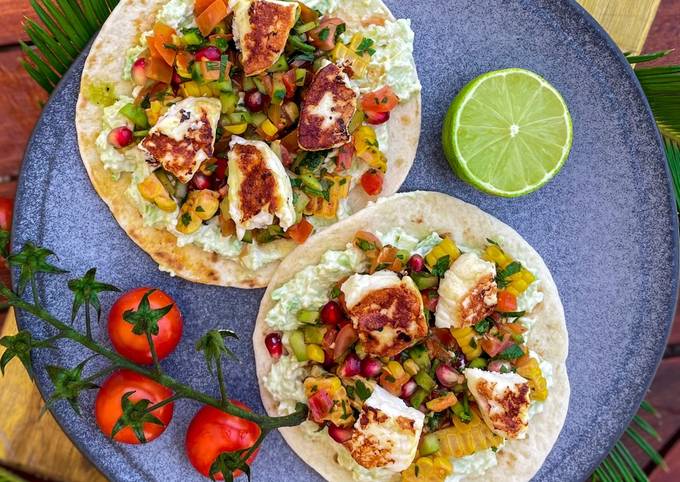 - Jetzt geht’s ans Anrichten. Dafür zuerst die Avocadocreme auf den Tacos verteilen, dann die Salsa darauf geben und den Grillkäse oben drauf legen. Sofort genießen..