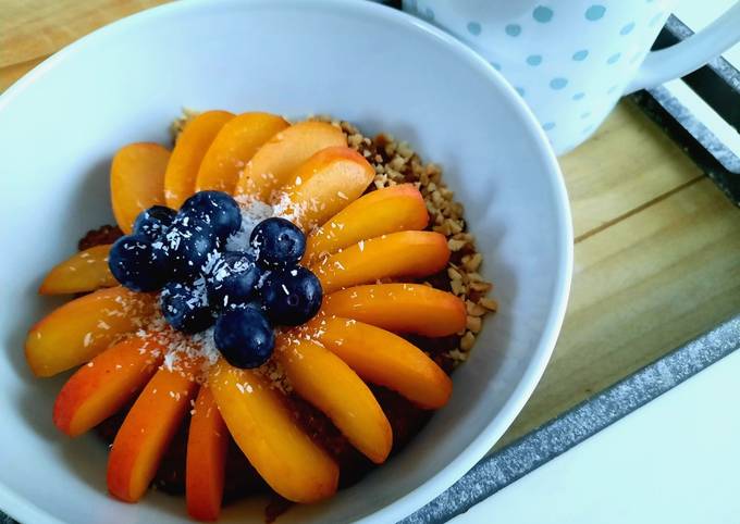 - Porridge in eine Schüssel geben und mit den Aprikosenspalten, Blaubeeren, Kokosraspeln und Haselnüssen anrichten..
