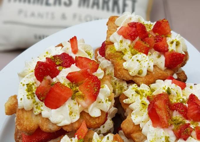 - Sahne steif schlagen und Joghurt unterrühren. Die Erdbeeren in Scheiben schneiden und etwas zuckern. Die Sahne-Joghurt Mischung in eine Spritztülle geben und auf die Blätterteigfächer in Tupfen aufspritzen..