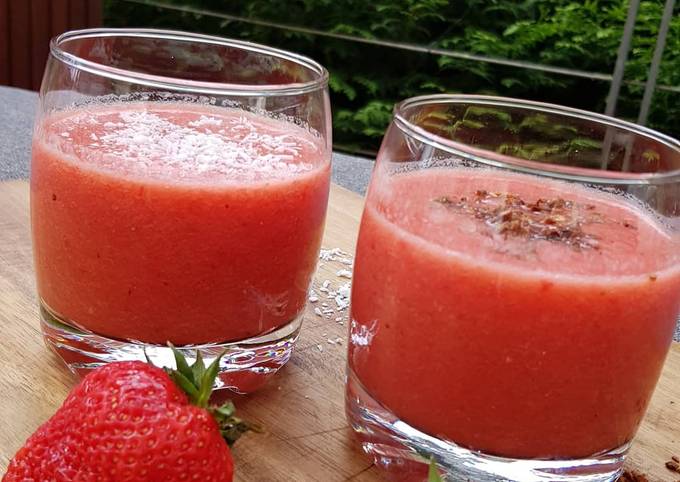 - Erdbeeren waschen, in Stücke schneiden, Melone auch in Stücke schneiden mit dem Zucker und dem Zitronensaft in den Mixer geben und zu einem leckeren Süppchen mixen. Etwas Kokosraspeln oder Crunch darübergeben und kalt genießen..
